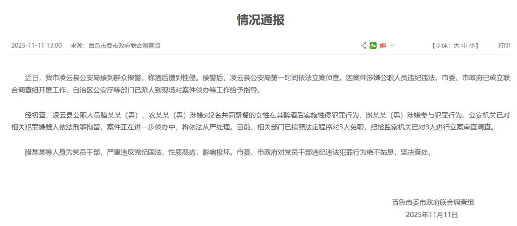 ·广西百色通报:两公职人员涉嫌性侵共同聚餐女性,已被刑拘。