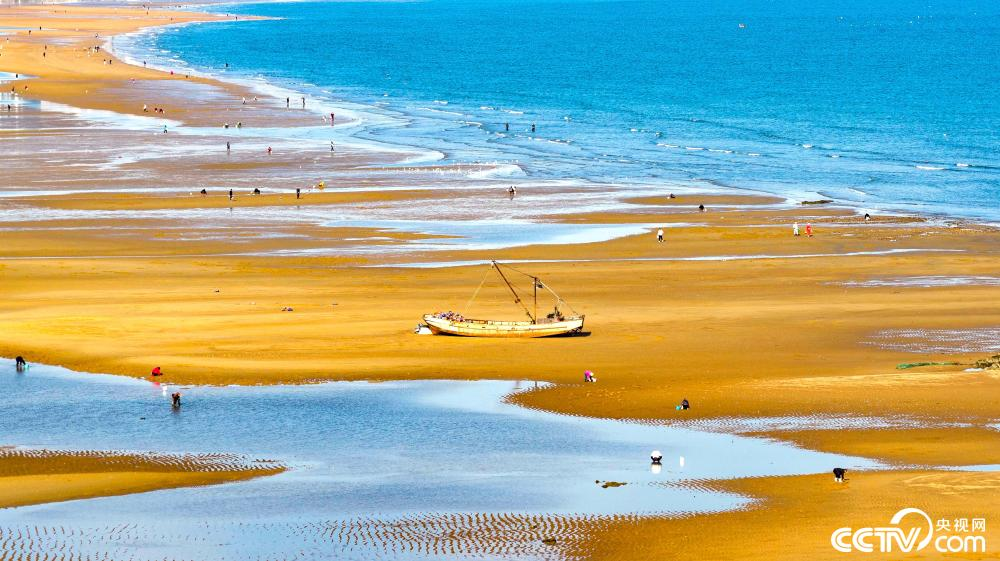 青岛市西海岸新区灵山湾碧海蓝天,退潮后裸露的沙滩细腻金黄,游人和市民在海滩上赶海,捡拾海鲜,共享大海的馈赠。