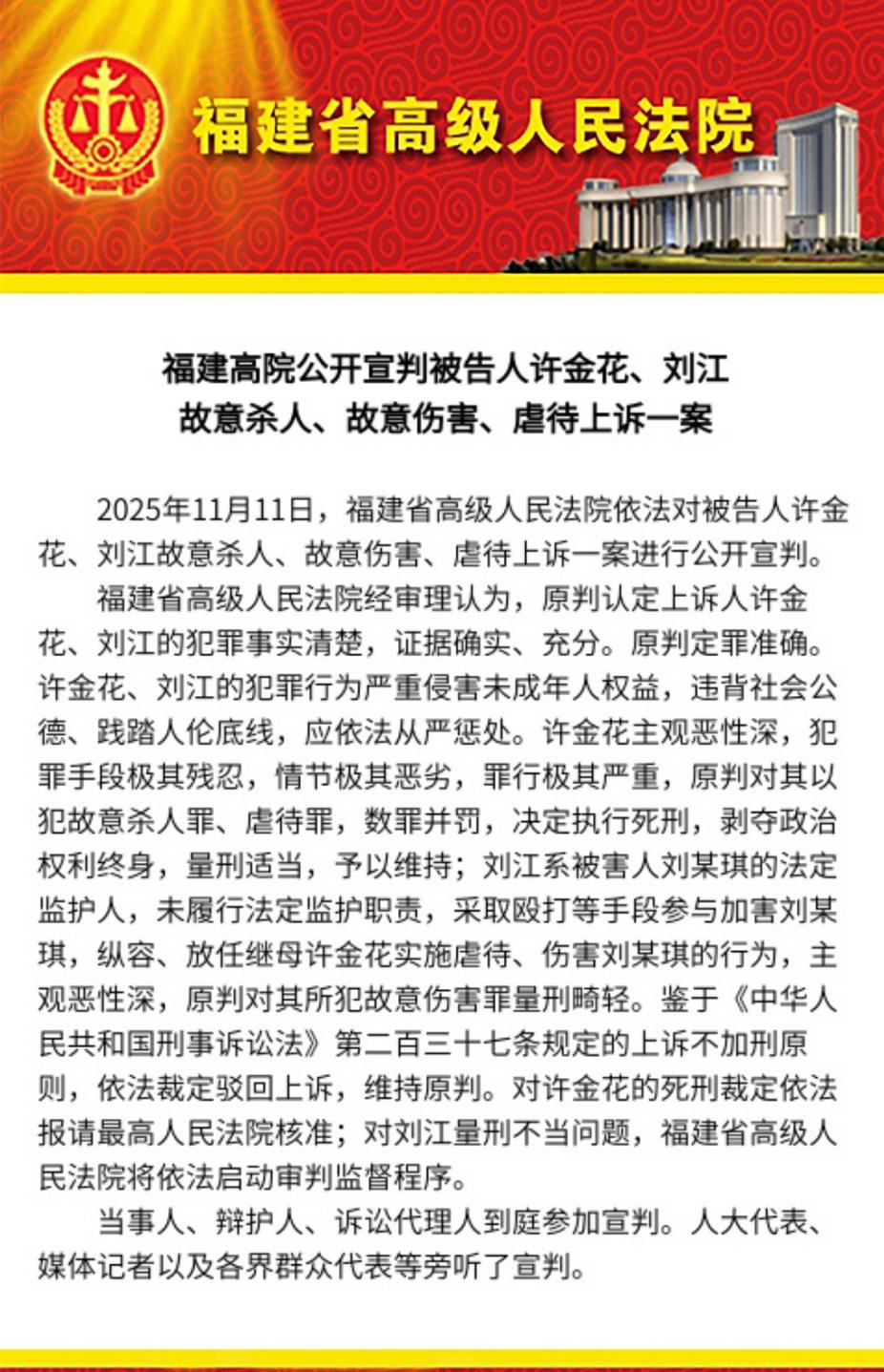 ·莆田12岁女孩被虐死案二审宣判:维持对继母许金花死刑判决。