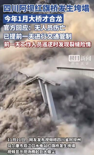 ·四川阿坝红旗特大桥发生垮塌,今年1月主跨刚合龙,官方回应:山体滑坡致边坡裂缝,已提前一天交通管制无人员伤亡。