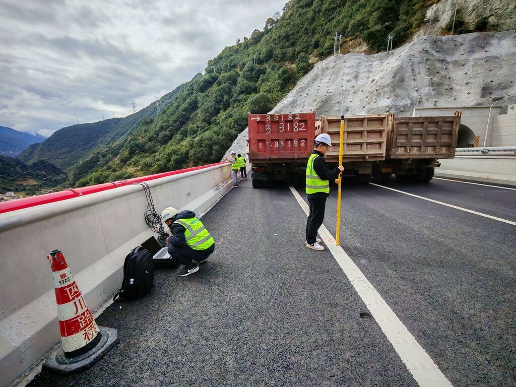 泸石高速桥隧占比达86.5%,其中泸定49公里通车路段内共设桥梁60余座。本次荷载试验,按照《公路工程质量鉴定办法》抽检要求,选取不同结构类型桥梁23座,通过在试验桥梁的桥面、桥侧、桥墩等位置布设大量监测点,将重载卡车分级有序进行指定位置停放、动态行进和刹停等检测动作,对桥梁的位移、振动等关键数据以动载与静载相结合的方式进行采集,全面评估桥梁结构安全性,历时两个月,圆满完成全部桥梁荷载试验。经检测,桥梁各项指标均符合设计及规范要求,标志着所有桥梁已具备通车条件。