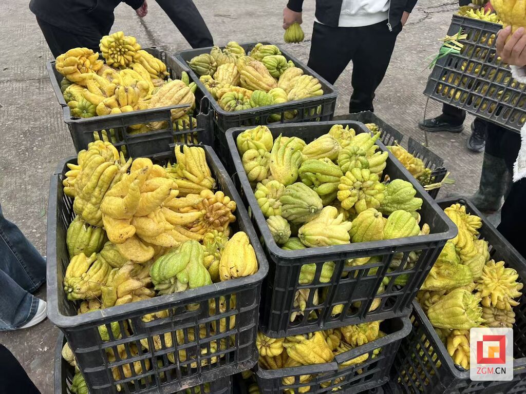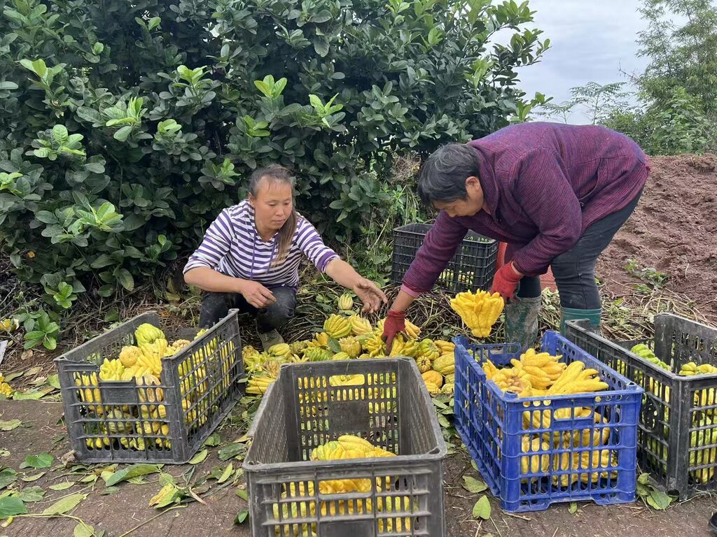 在收获现场,农户们背着背篓、手持工具穿梭林间,熟练地采摘果实,再将一篓篓果实运到路边进行分拣、装箱,一筐筐“黄金果”被集中装车运往加工车间,现场一派繁忙的丰收景象。据产业园业主江先华介绍,腰塘村川佛手种植面积达1300多亩,每年7月至12月底为采摘期,可持续采摘半年左右,部分果树上还呈现花果同株的独特景观。“今年产量与往年基本持平,基地内长期保持30至40人作业,采收旺季用工量还会增加。”江先华说。
