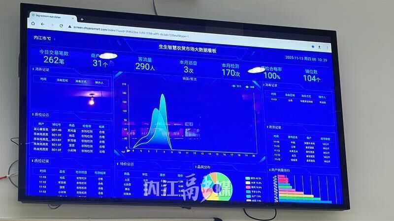 11月13日清晨,在内江市中区新光北路的一座农贸市场内,前来买菜的市民纷纷围拢在一块电子屏幕前,盯着屏幕上实时滚动播报的当日蔬菜、肉类、水产参考价,以及最新农残快检结果。“白菜合格”“黄瓜合格”等字样,让不少人放心点头。这家开业不满一月的农贸市场,凭着无处不在的“科技感”,彻底打破了传统农贸市场“靠经验选菜、凭信任消费”的旧模式,成为周边居民“买得安心、用得省心”的“买菜新地标”。