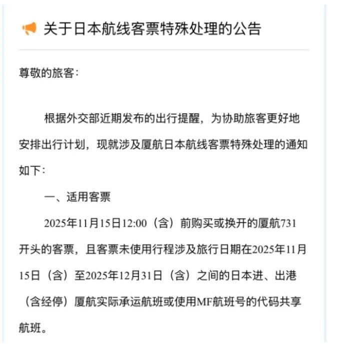 南航在通知中明确,对于在今年11月15日12:00(含)前购买或换开的南航784开头的客票,且客票未使用行程涉及旅行日期在2025年11月15日(含)至2025年12月31日(含)之间的日本进、出港(含经停)南航实际承运航班或使用CZ航班号的代码共享航班,航班起飞前取消已定妥座位的旅客,在客票有效期内申请退票,免收退票费。首次变更至相同航程的南航实际承运航班,免收变更费,如发生票价价差按规定收取。