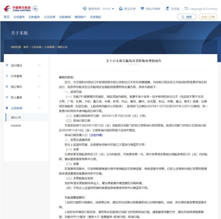 东航在通知中明确,对于在今年11月15日12:00(含)前购买或换开的东航781客票填开的国际、地区或国内航班。客票中至少含有一段未使用的涉及日本(包括但不限于东京、大阪、广岛、札幌、小松、鹿儿岛、长崎、新泻、冈山、福冈、静冈、名古屋、松山、冲绳、富山、熊本)进港、出港或经停航班(包括东航、上航或其他航空公司航班),航班起飞日期在2025年11月15日至2025年12月31日期间,同一客票内的其他未使用航段日期不限。办理变更至原航班前后3天(含)以内的航班,可免费变更一次。再次变更或变更超出原航班前后3天(含)内的航班,需依据客票使用条件办理。在客票有效期内,可至原购票渠道办理未使用航段非自愿退票,免收退票手续费。