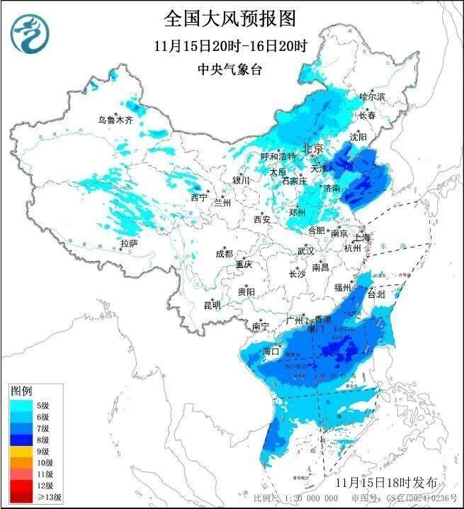 17日至18日,寒潮继续南下,南方风力也将明显增大,江南、华南部分地区阵风也能达到6至8级。另外,16日至19日,冷空气入海,我国东部和南部海区将先后出现6至8级大风、阵风9至10级,其中18日,东海南部、台湾海峡、南海北部的阵风有可能达到9至10级或更强,海上航行需特别注意安全。
