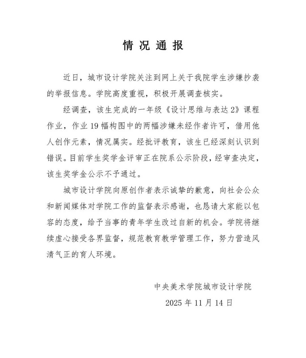 ·学生抄袭还获一等奖学金?中央美术学院通报:经审查决定该生奖学金公示不予通过。