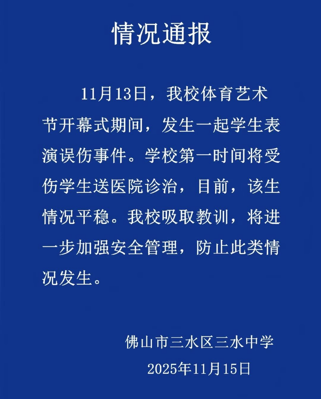 ·佛山一中学通报“学生表演误伤事件”:受伤学生情况平稳。