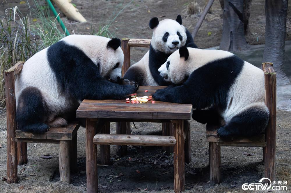 11月15日,重庆动物园,大熊猫围桌聚餐、畅玩冰雪,乐享冬日美好时光。