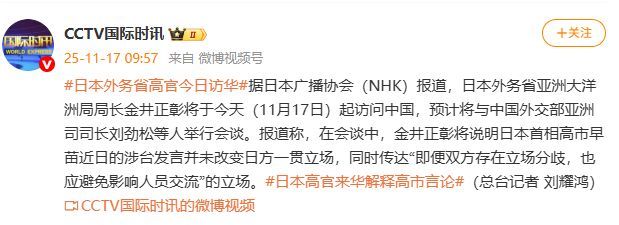 据@CCTV国际时讯消息,据日本广播协会(NHK)报道,日本外务省亚洲大洋洲局局长金井正彰将于今天(11月17日)起访问中国,预计将与中国外交部亚洲司司长刘劲松等人举行会谈。报道称,在会谈中,金井正彰将说明日本首相高市早苗近日的涉台发言并未改变日方一贯立场,同时传达“即便双方存在立场分歧,也应避免影响人员交流”的立场。(总台记者 刘耀鸿)
