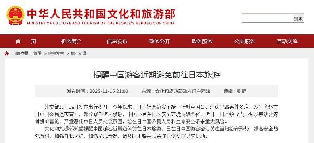 文化和旅游部郑重提醒中国游客近期避免前往日本旅游,已在日中国游客密切关注当地治安形势,提高安全防范意识,加强自我保护,如遇紧急情况,请及时报警并联系驻日使领馆寻求协助。