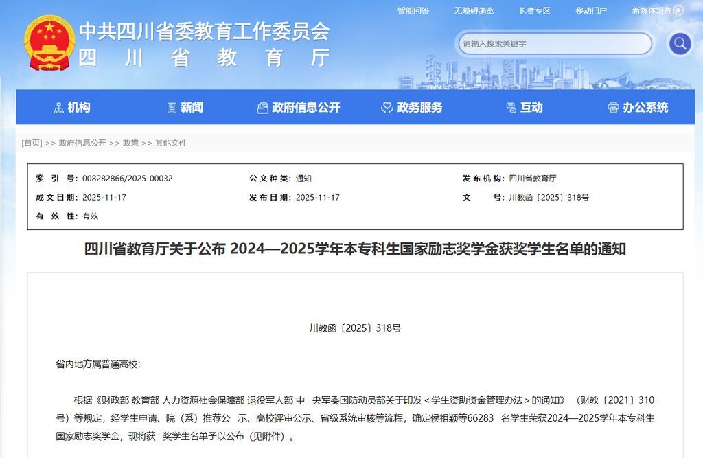 11月18日,川观新闻记者从省教育厅获悉,2025年研究生学业奖学金和2024—2025学年本专科生国家励志奖学金的获奖学生名单在四川省教育厅官网公布。