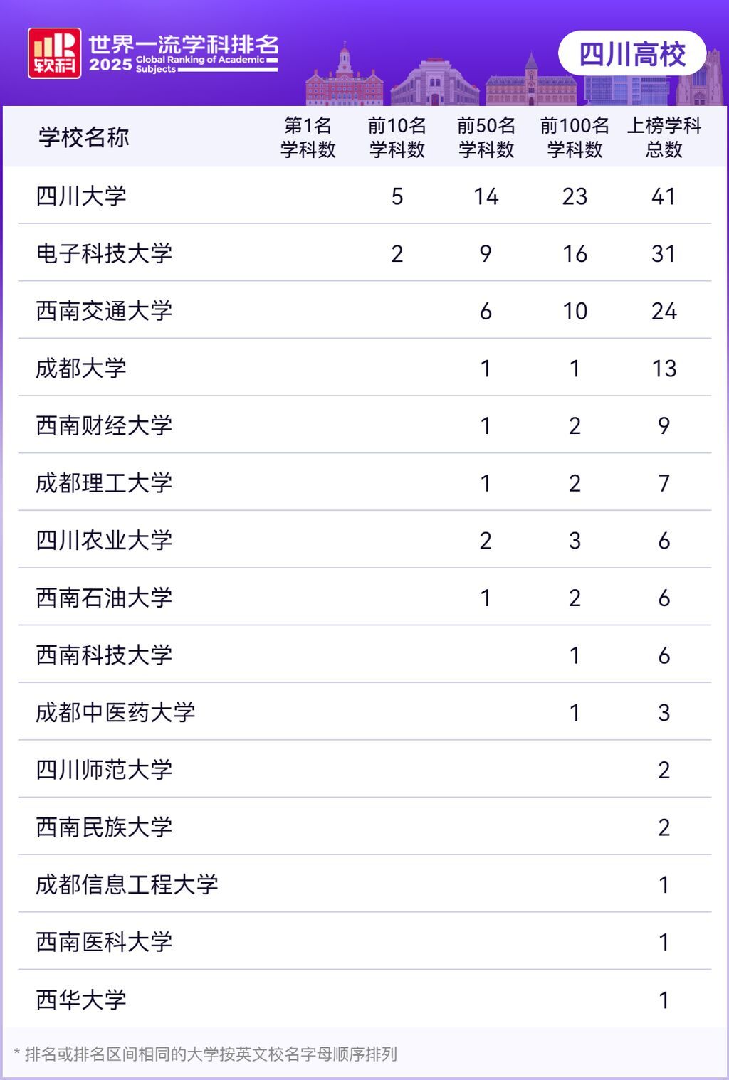 在2025软科世界一流学科排名中,四川高校表现亮眼,15所高校的153个学科榜上有名。从上榜学科总数来看,四川大学领跑全省,有41个学科上榜。电子科技大学紧随其后,上榜学科31个。西南交通大学(24个)和成都大学(13个)的上榜学科数在10个以上。西南财经大学(9个)、成都理工大学(7个)、四川农业大学(6个)、西南石油大学(6个)、西南科技大学(6个)、成都中医药大学(3个)、四川师范大学(2个)、西南民族大学(2个)、成都信息工程大学(1个)、西南医科大学(1个)、西华大学(1个)等高校也均有学科上榜。