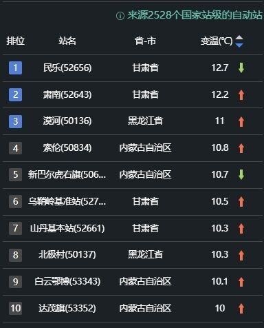 北方在寒潮主体远离后,则开始回暖。今天甘肃、内蒙古、黑龙江部分站点升温超8℃,甘肃民乐升温12.7℃、肃南12.2℃,黑龙江漠河升温11℃,为14时升温最强的地方。