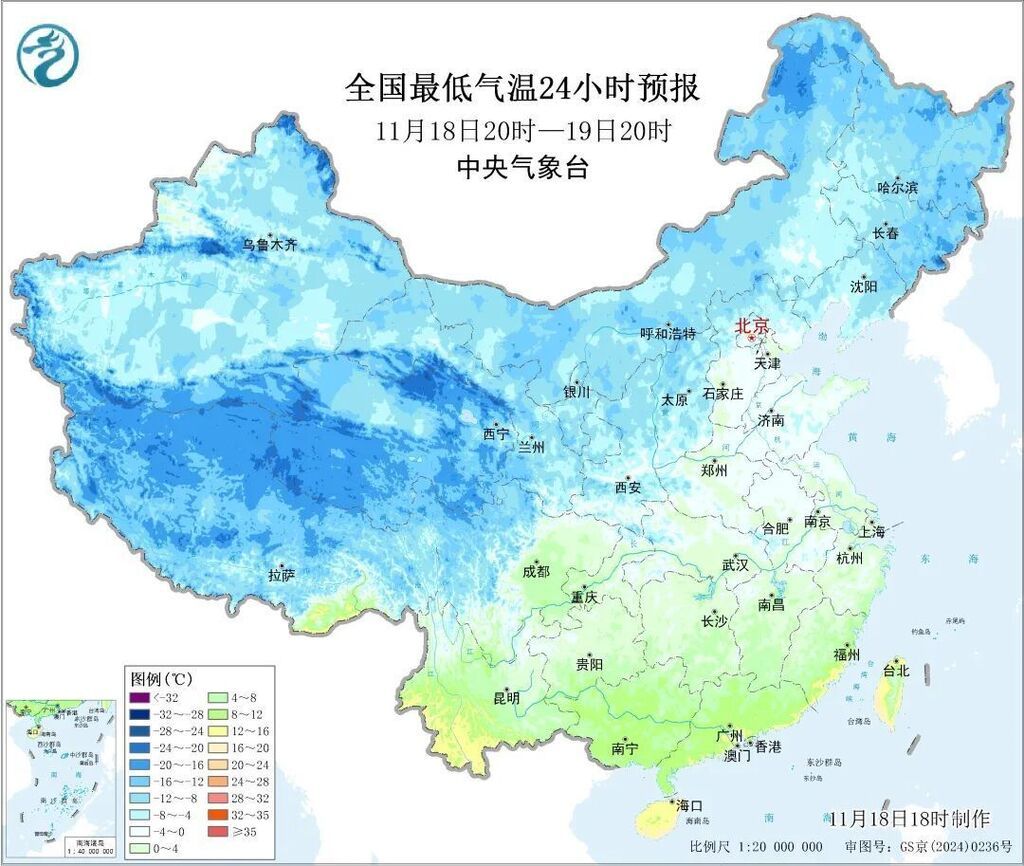对于南方来说,明天早晨才是此轮寒潮过程气温的最低谷!最低气温0℃线的南界将抵达安徽南部、湖北北部一带,气温将大面积创新低,合肥或将是今年下半年来首次跌破0℃,长江中下游到西南东部基本不足5℃,华南多地最低气温只有10℃出头。