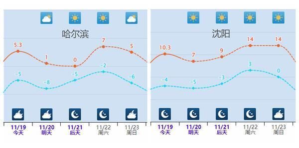 特别是东北地区多地,升温最为明显,22日至23日最高气温将会较常年11月下旬偏高10℃左右,哈尔滨22日最高气温7℃,长春22日最高气温8℃,沈阳22日最高气温可达14℃。