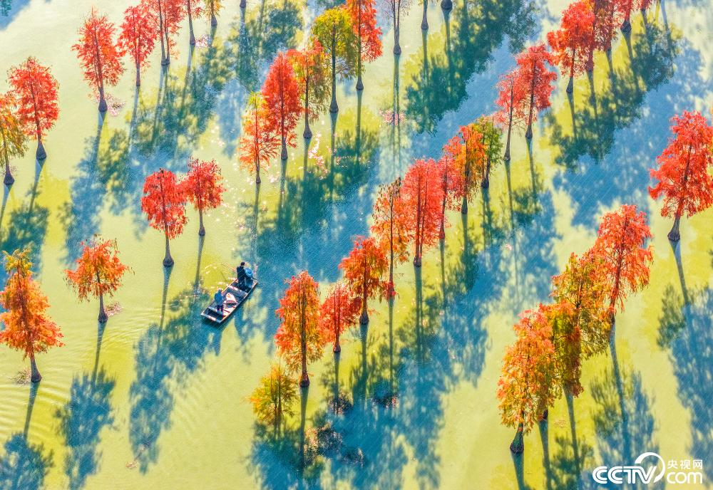 11月19日,江苏宿迁泗洪县临淮镇生态养殖基地,在无人机俯瞰下,碧绿湖水与赤红水杉交相辉映,绘就绝美生态画卷。