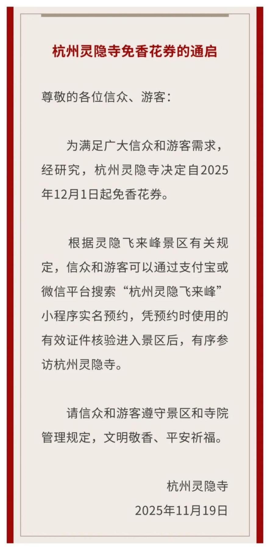 ·杭州灵隐寺12月1日起免门票,需至少提前一天预约。