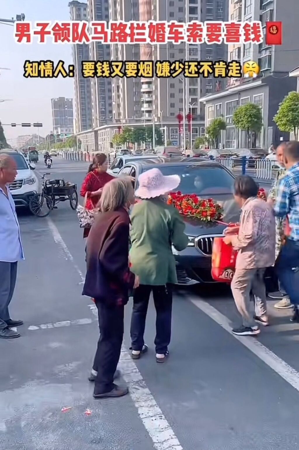 这都什么年代了,还有人强行拦婚车讨喜烟,不给不让走?江苏一对新人婚车好几次被拦下。新娘怒了:不惯着,直接走下婚车步行去酒店!
