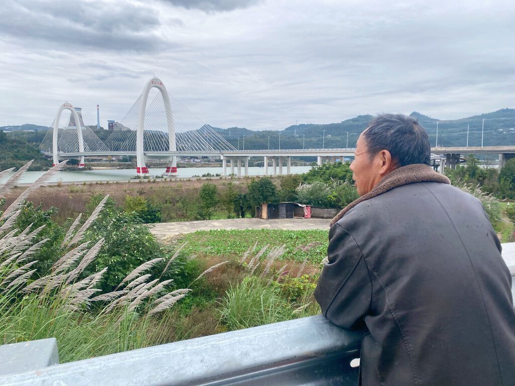 胡家梁社区居民宁显培靠着百利大桥下行道路的围栏,目光掠过桥下种植青菜的土地——那里曾是他的家,如今菜苗青嫩;再远处,苍溪县嘉陵江百利大桥横跨江面,车流往来不息。