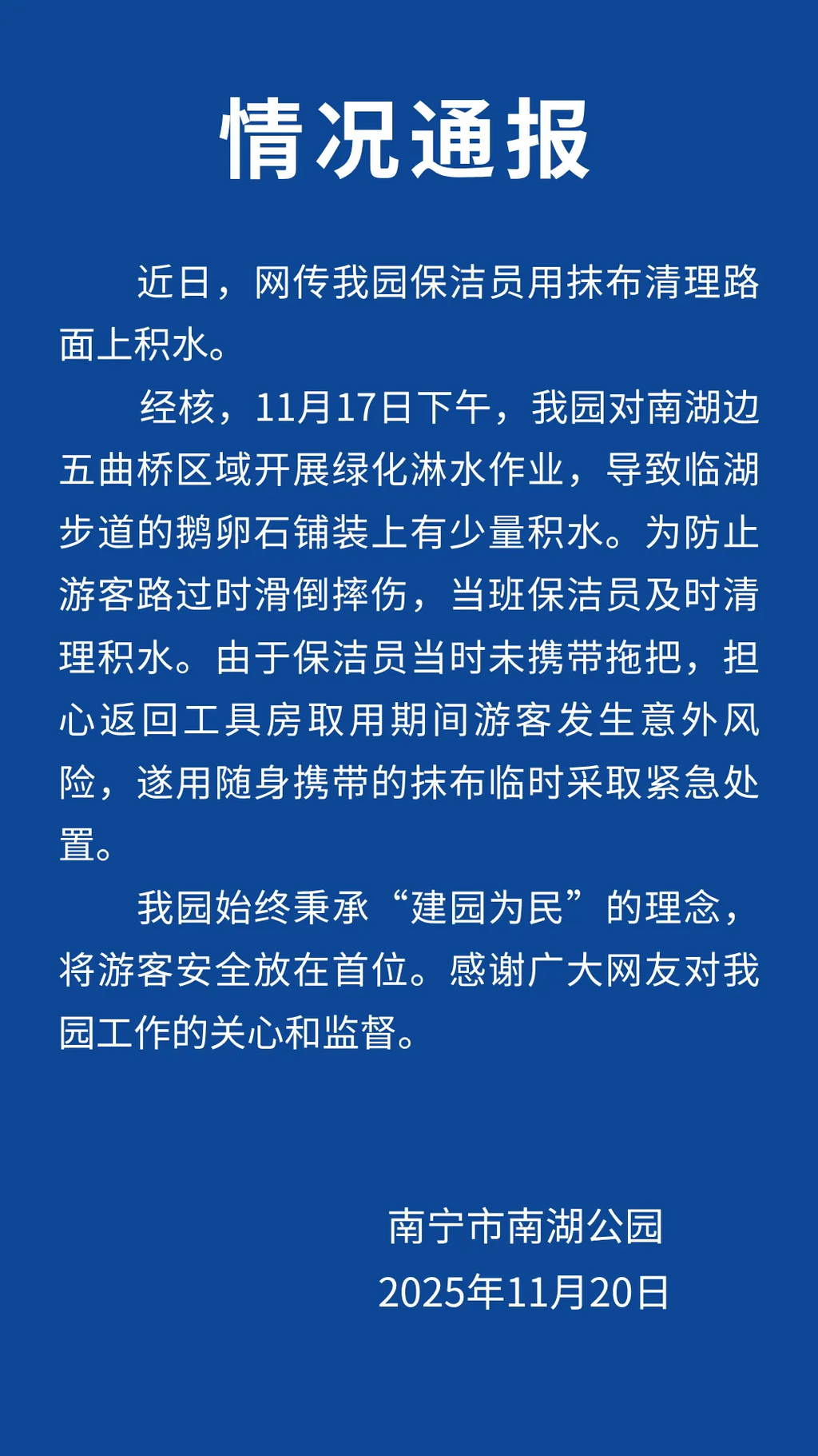 ·南宁环卫阿姨被要求用抹布逐个清理石缝积水?南湖公园回应。