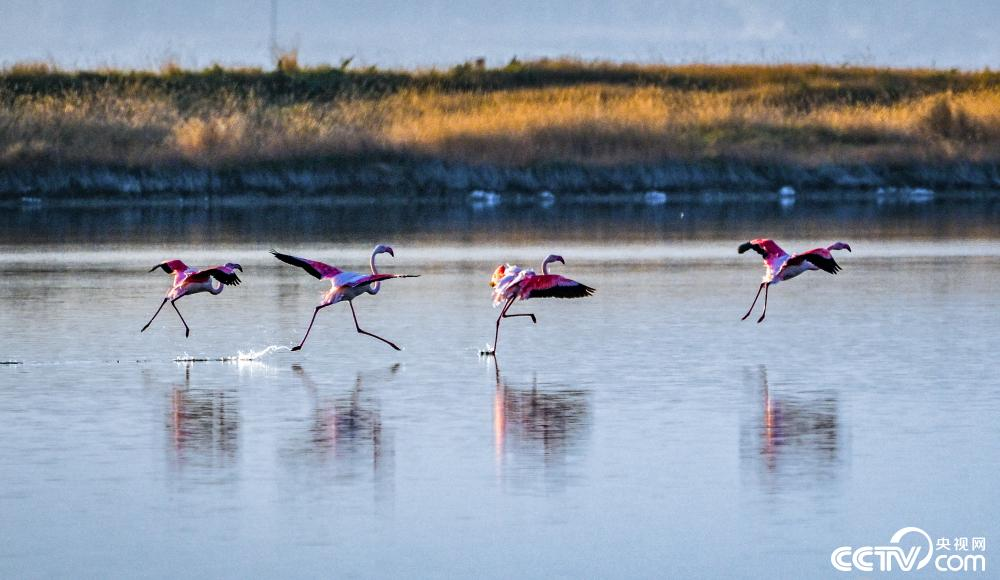 11月19日,山西运城,火烈鸟飞抵盐湖湿地栖息越冬,它们或觅食、或飞舞,成为盐湖冬季一道亮丽的风景,吸引全国各地摄影爱好者前来拍摄。