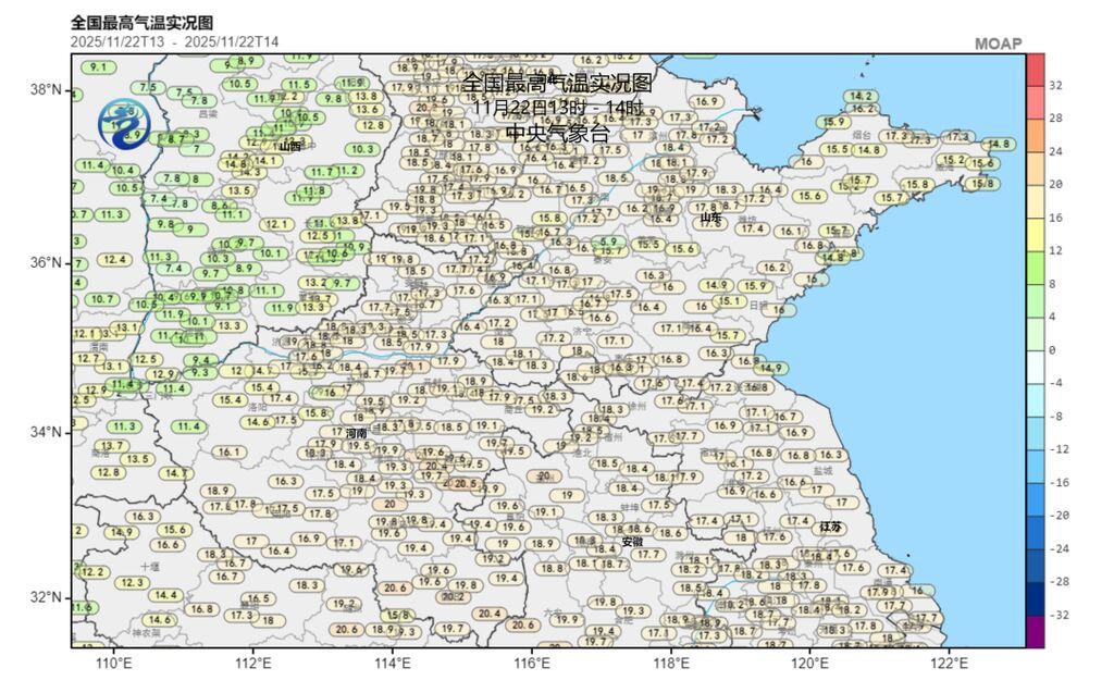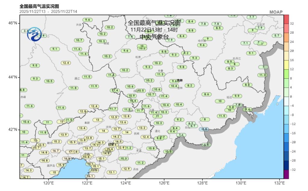 下午14时左右,沈阳14.3℃,石家庄19.5℃、郑州18.2℃都比常年同期显著偏暖。