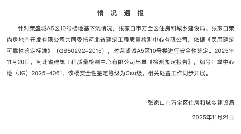 ·张家口万全区住建局再通报“一小区地基下沉”:构成局部危房,正开展处置。