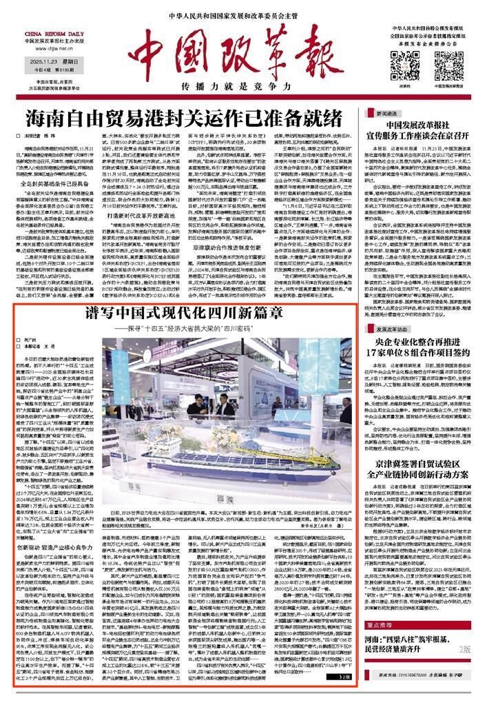 如今,站在“十四五”收官与“十五五”谋划的关键节点,四川省高质量发展势头愈加强劲。四川省相关负责人表示,四川将持续把新质生产力作为核心引擎,科学谋划储备“十五五”期间重大项目,以更多高质量项目支撑高质量发展;实施大规模新型技术改造,推动“AI+工业”深度融合;持续优化营商环境,大力发展实体经济,培育更多优质经营主体,争创全国新型工业化示范区和未来产业先导区,推动四川在高质量发展的道路上阔步前行,以全面深化改革开放为笔,奋力谱写中国式现代化四川新篇章。