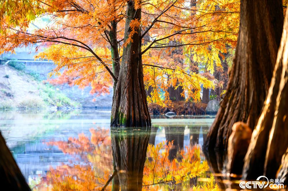11月22日,江苏省南京市,明孝陵落羽杉换上了金黄与橙红交织的新衣,在阳光下色彩斑斓,在水面倒映下仿佛一幅油画。