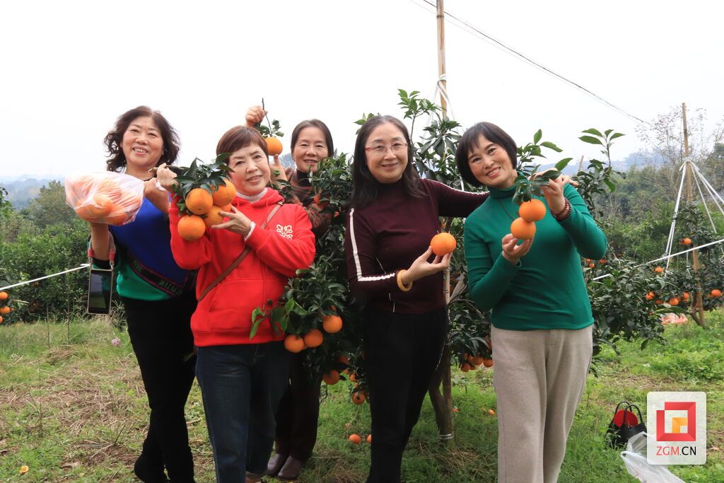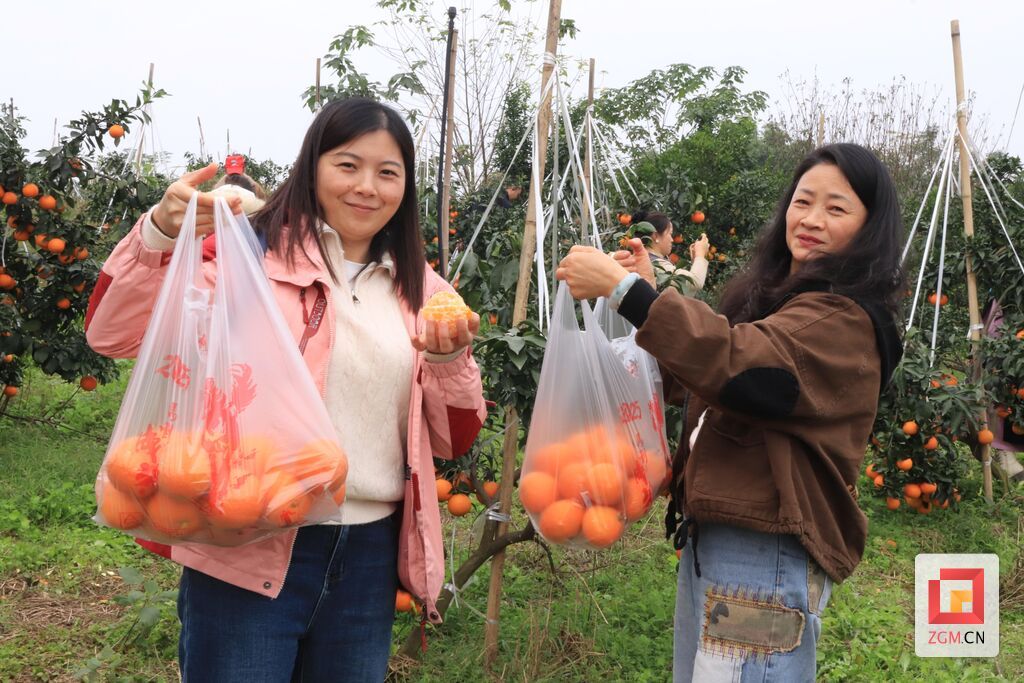 果园里,金灿灿的爱媛38挂满枝头,像一个个小灯笼,映照着游客们喜悦的脸庞。泸州游客吴学兰一边采摘一边赞叹:“这个柑子好摘得很,一撇就断,巴适得很!”话音未落,她已利落地从枝头摘下一个果子。