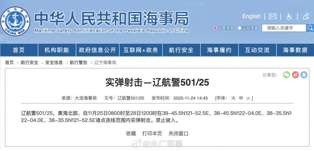 大连海事局发布航行警告,自11月25日9时至16时,渤海部分海域执行军事任务;自11月25日8时至28日12时,黄海北部部分海域实弹射击,禁止驶入。