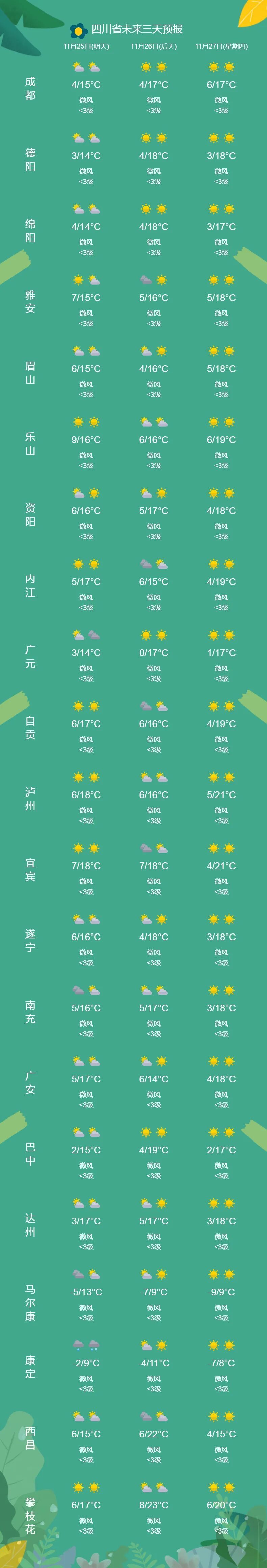 今天,省内各地气象台争相宣布好消息:成都“晒太阳的黄金时间已到”;乐山“本周晴天‘霸屏’”;眉山“未来一周天气晴好”;内江“本周开启全晴模式”;达州“本周阳光‘管够’”……