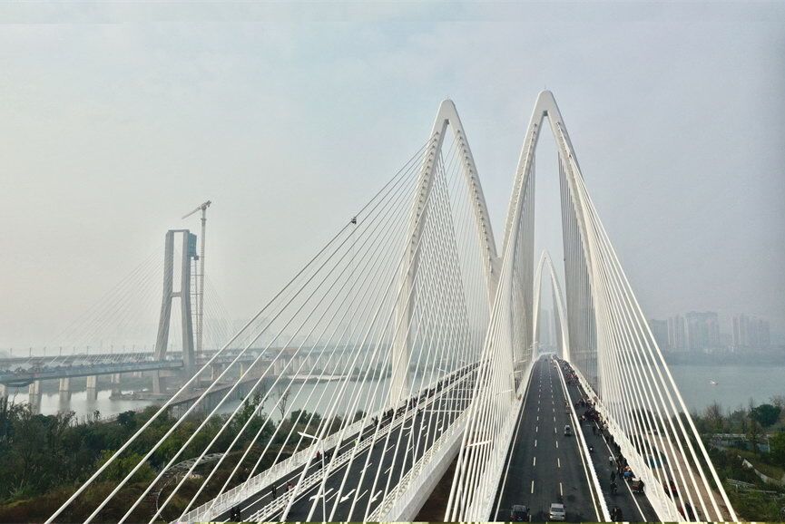 在3年的建设周期中,建设者攻克复杂地质条件、大跨度梁体施工、曲线索塔精度控制等技术难题,运用先进的桥梁建造技术与材料,确保了工程质量与安全。从钢混组合结构的创新应用到斜拉索张拉的精准控制,从环保施工技术的全面推广到智慧交通系统的配套建设,涪江六桥的每处细节都凝聚着创新智慧。