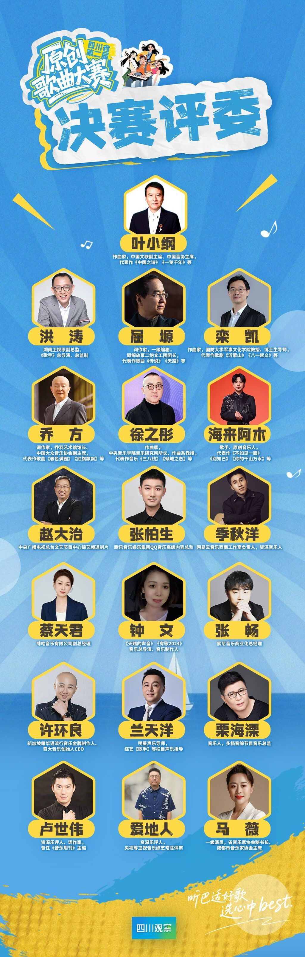 本届大赛评委阵容全面升级,兼具权威性、多元性与产业性,评委会主席由著名作曲家、中国文联副主席、中国音协主席叶小纲担任。19位评委,既有深耕创作领域的词曲作家、一线音综导演及制作人,也有资深声乐导师、专业乐评人,更汇聚主流音乐平台与头部唱片公司负责人,全面覆盖音乐产业全链路,贯通创作、表演、传播环节。