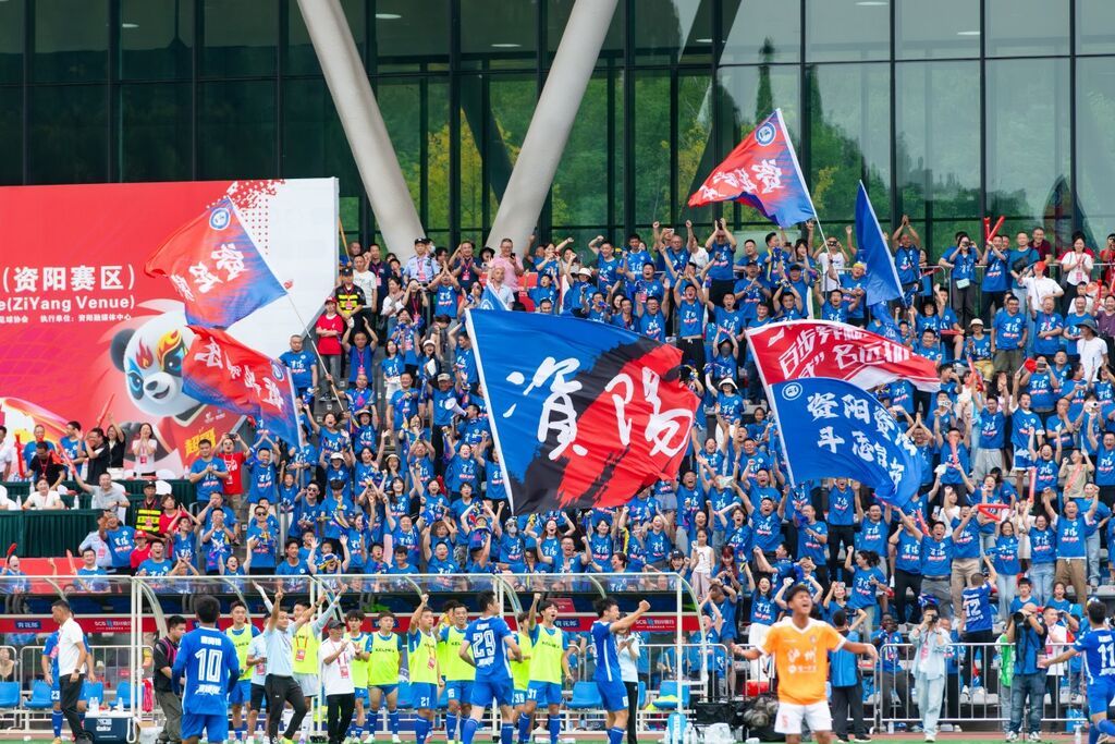 “资阳雄起!”“继续战斗!”川超赛场的看台上,无论主场还是客场,资阳球迷的呐喊从未停歇,从5岁的小孩到75岁的老人,都在为家乡球队全力助威。无论比分胶着还是暂时落后,他们始终举着横幅、摇着旗帜,用响亮的声音筑起“第十二人”的坚固防线。