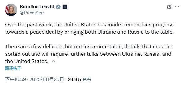 按25日披露的美方官员的消息,乌克兰已同意这项和平协议,“还有一些细节需要解决”。至于这部分需要解决的“细节”,美国白宫新闻秘书莱维特于当日稍晚时的声明中也有所提及:“还有一些棘手但并非不可克服的关键细节亟待解决,这将需要乌克兰、俄罗斯和美国之间进行进一步谈判。”美国总统特朗普也在随后表达了对达成协议的期待,他认为俄乌和平协议已“非常接近达成”。