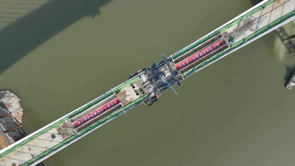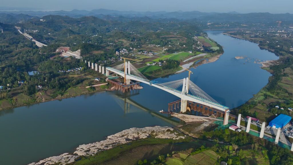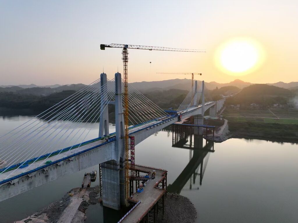 据中铁十五局成达万高铁项目二工区副经理王荣超介绍,中跨合龙段长2米、宽14.6米、高6.7米,通过现浇混凝土实现合龙,由于合龙段位于渠江中心,为确保合龙精准可控,创新采用“吊架法”施工。针对大跨度斜拉桥合龙段受力复杂、温度变形敏感、精度控制要求高等技术难点,团队选择夜间“温度低、温差小”时段进行合龙,有效减少温度变化引起的结构变形,并通过线形监控、劲性锁定等关键技术措施,最终将线形精度控制在“毫米级”范围,实现高质量合龙。