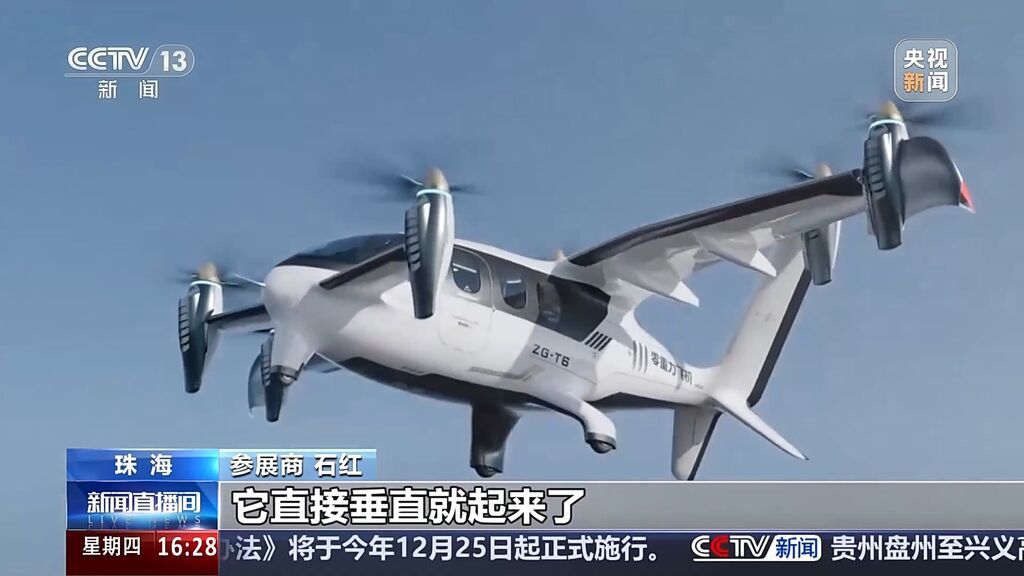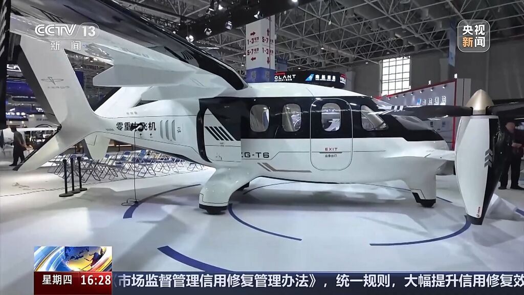 参展商 石红:这是我们第一次向公众展示,一款6座eVTOL,现阶段它的设计航程是300公里,续航时间是一个半小时。首先它在起降状态下是一个直升机的形态,减少了对跑道的需求。飞到空中之后它会切换成前飞状态,升力的旋翼会切换为拉力的螺旋桨,就成了一架固定翼飞机,以此来实现它的高效率飞行,具备了固定翼飞机的航程优势、航速优势以及载荷优势。