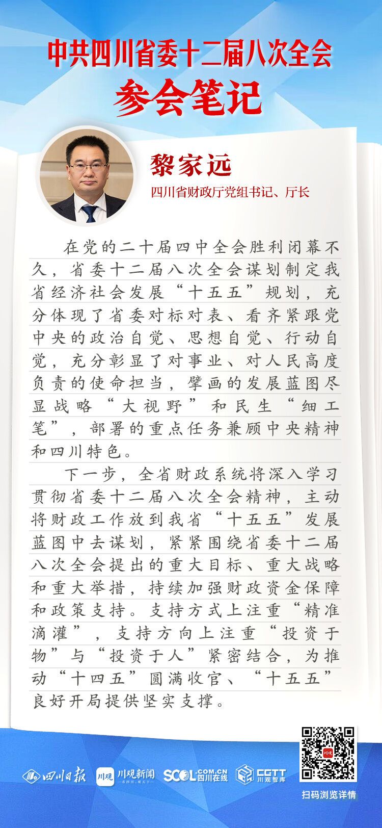 在党的二十届四中全会胜利闭幕不久,省委十二届八次全会谋划制定我省经济社会发展“十五五”规划,充分体现了省委对标对表、看齐紧跟党中央的政治自觉、思想自觉、行动自觉,充分彰显了对事业、对人民高度负责的使命担当,擘画的发展蓝图尽显战略“大视野”和民生“细工笔”,部署的重点任务兼顾中央精神和四川特色。