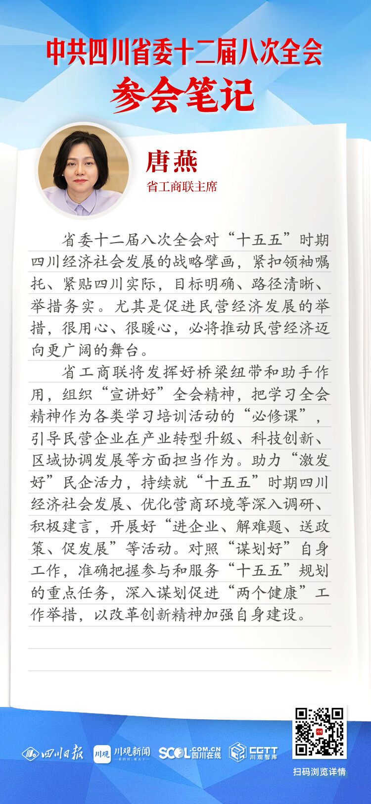 省委十二届八次全会对“十五五”时期四川经济社会发展的战略擘画,紧扣领袖嘱托、紧贴四川实际,目标明确、路径清晰、举措务实。尤其是促进民营经济发展的举措,很用心、很暖心,必将推动民营经济迈向更广阔的舞台。