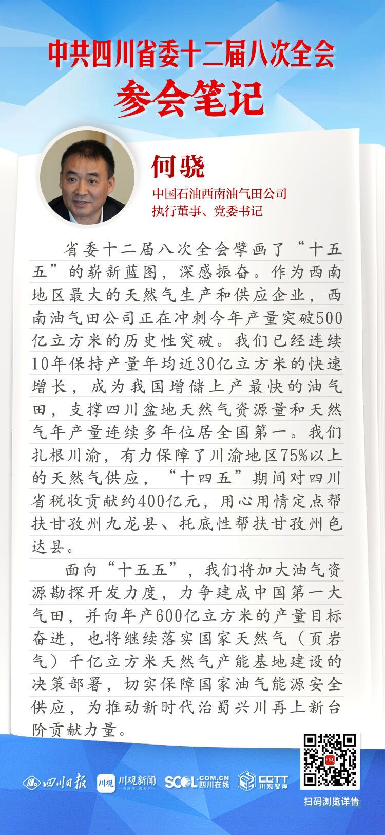 省委十二届八次全会擘画了“十五五”的崭新蓝图,深感振奋。作为西南地区最大的天然气生产和供应企业,西南油气田公司正在冲刺今年产量突破500亿立方米的历史性突破。我们已经连续10年保持产量年均近30亿立方米的快速增长,成为我国增储上产最快的油气田,支撑四川盆地天然气资源量和天然气年产量连续多年位居全国第一。我们扎根川渝,有力保障了川渝地区75%以上的天然气供应,“十四五”期间对四川省税收贡献约400亿元,用心用情定点帮扶甘孜州九龙县、托底性帮扶甘孜州色达县。