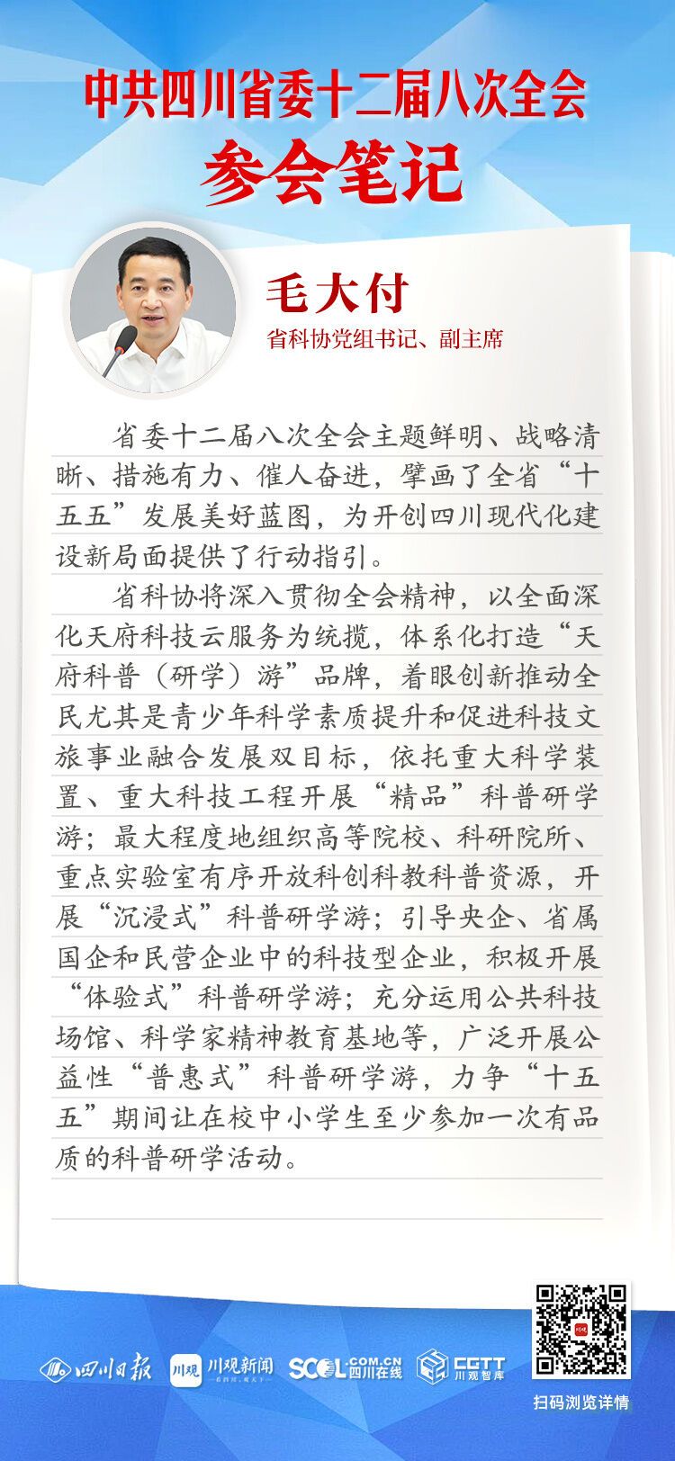 省科协将深入贯彻全会精神,以全面深化天府科技云服务为统揽,体系化打造“天府科普(研学)游”品牌,着眼创新推动全民尤其是青少年科学素质提升和促进科技文旅事业融合发展双目标,依托重大科学装置、重大科技工程开展“精品”科普研学游;最大程度地组织高等院校、科研院所、重点实验室有序开放科创科教科普资源,开展“沉浸式”科普研学游;引导央企、省属国企和民营企业中的科技型企业,积极开展“体验式”科普研学游;充分运用公共科技场馆、科学家精神教育基地等,广泛开展公益性“普惠式”科普研学游,力争“十五五”期间让在校中小学生至少参加一次有品质的科普研学活动。