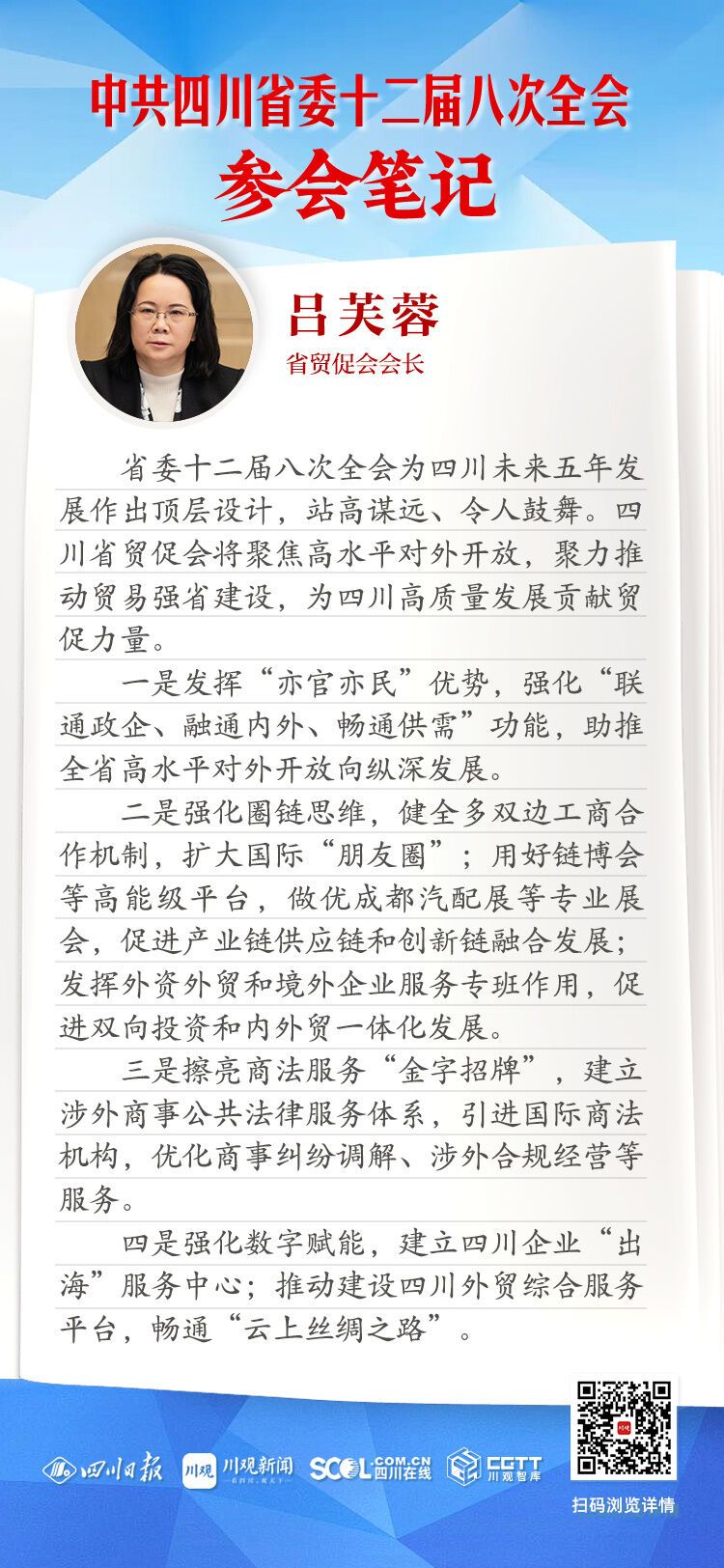 省委十二届八次全会为四川未来五年发展作出顶层设计,站高谋远、令人鼓舞。四川省贸促会将聚焦高水平对外开放,聚力推动贸易强省建设,为四川高质量发展贡献贸促力量。