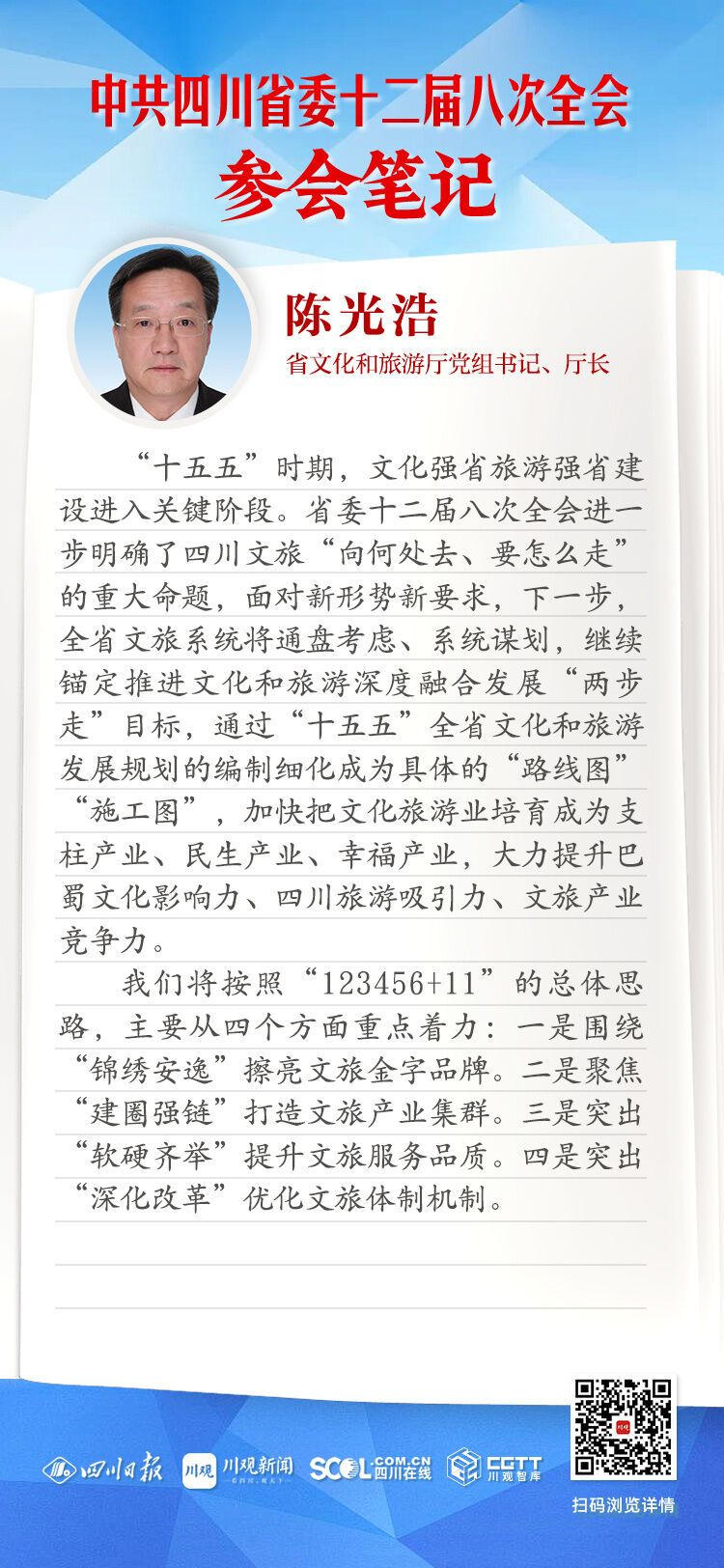 我们将按照“123456+11”的总体思路,主要从四个方面重点着力:一是围绕“锦绣安逸”擦亮文旅金字品牌。二是聚焦“建圈强链”打造文旅产业集群。三是突出“软硬齐举”提升文旅服务品质。四是突出“深化改革”优化文旅体制机制。