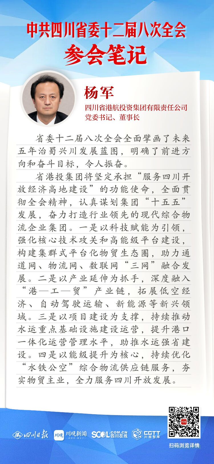 省港投集团将坚定承担“服务四川开放经济高地建设”的功能使命,全面贯彻全会精神,认真谋划集团“十五五”发展,奋力打造行业领先的现代综合物流企业集团。一是以科技赋能为引领,强化核心技术攻关和高能级平台建设,构建集群式平台化物贸生态圈,助力通道网、物流网、数联网“三网”融合发展。二是以产业延伸为抓手,深度融入“港—工—贸”产业链,拓展低空经济、自动驾驶运输、新能源等新兴领域。三是以项目建设为支撑,持续推动水运重点基础设施建设运营,提升港口一体化运营管理水平,助推水运强省建设。四是以能级提升为核心,持续优化“水铁公空”综合物流供应链服务,夯实物贸主业,全力服务四川开放发展。