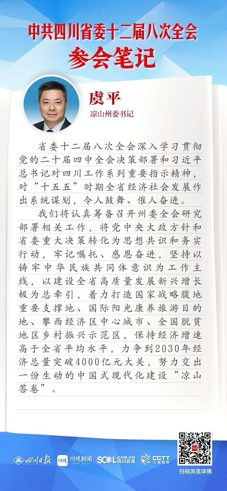我们将认真筹备召开州委全会研究部署相关工作,将党中央大政方针和省委重大决策转化为思想共识和务实行动,牢记嘱托、感恩奋进,坚持以铸牢中华民族共同体意识为工作主线,以建设全省高质量发展新兴增长极为总牵引,着力打造国家战略腹地重要支撑地、国际阳光康养旅游目的地、攀西经济区中心城市、全国脱贫地区乡村振兴示范区,保持经济增速高于全省平均水平,力争到2030年经济总量突破4000亿元大关,努力交出一份生动的中国式现代化建设“凉山答卷”。