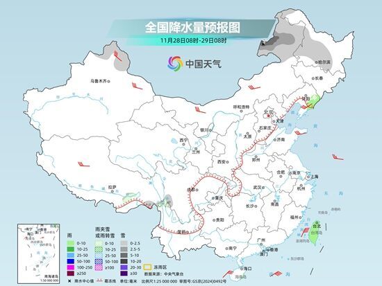 具体来看,今天新疆北疆北部、内蒙古东部、黑龙江中部、西藏东南部等地部分地区有小雪或雨夹雪,其中,内蒙古东北部局地有中到大雪。辽宁东部、台湾岛等地部分地区有小雨。