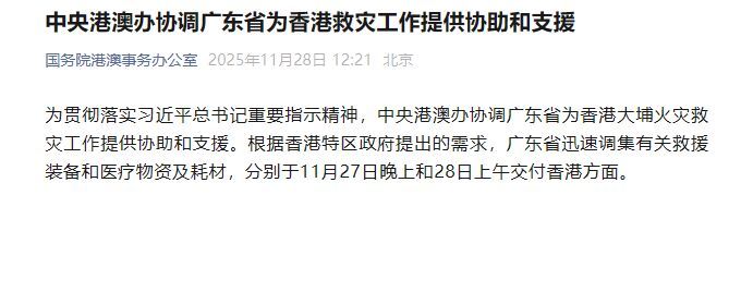 为贯彻落实习近平总书记重要指示精神,中央港澳办协调广东省为香港大埔火灾救灾工作提供协助和支援。根据香港特区政府提出的需求,广东省迅速调集有关救援装备和医疗物资及耗材,分别于11月27日晚上和28日上午交付香港方面。