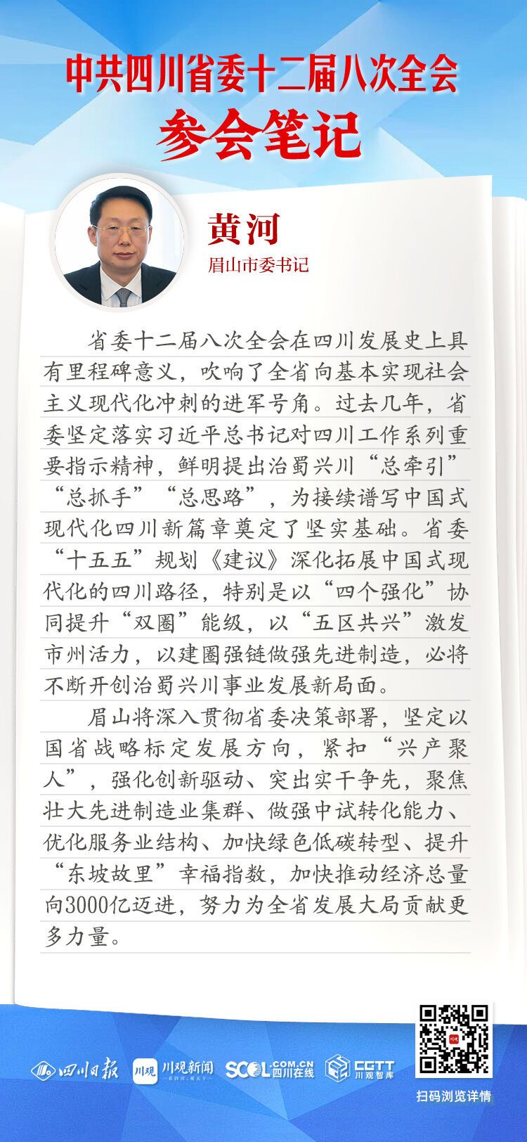 眉山将深入贯彻省委决策部署,坚定以国省战略标定发展方向,紧扣“兴产聚人”,强化创新驱动、突出实干争先,聚焦壮大先进制造业集群、做强中试转化能力、优化服务业结构、加快绿色低碳转型、提升“东坡故里”幸福指数,加快推动经济总量向3000亿元迈进,努力为全省发展大局贡献更多力量。